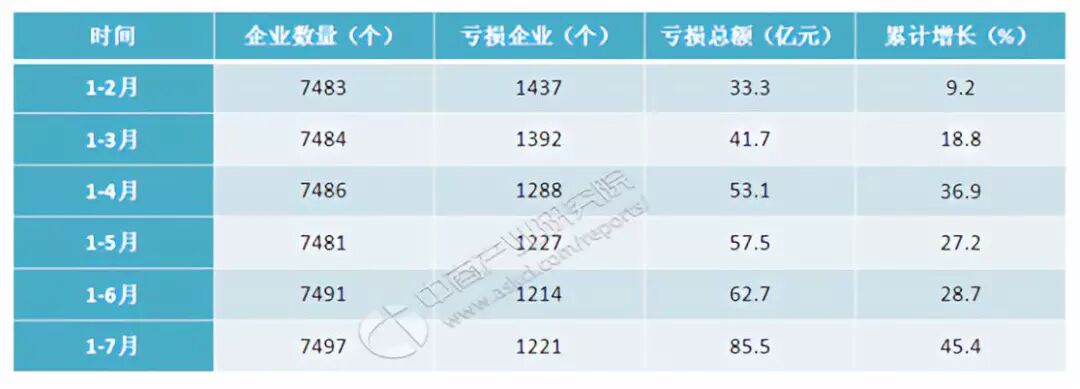 截止2018年7月底,我国医药行业规模以上企业数量达到7497家,其中亏损企业数量1221家,亏损面16.3%,较上个月提高了0.1个百分点,2018年前7个月医药行业亏损总额85.5亿元,累计同比增长45.4%。