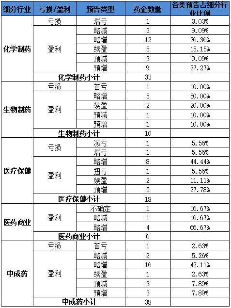 在盈利的企业中,除医疗保健细分行业外预减、略减的企业占比也较高,企业经营业绩持续增长的压力较大。两票制、严控药占比、重点监控和辅助用药等政策的实施对医药行业的利润影响仍在持续。化学制药、生物制药、医药商业和中成药预减、略减合计占细分行业的比例分别为18.18%、10%、16.67%和13.16%。