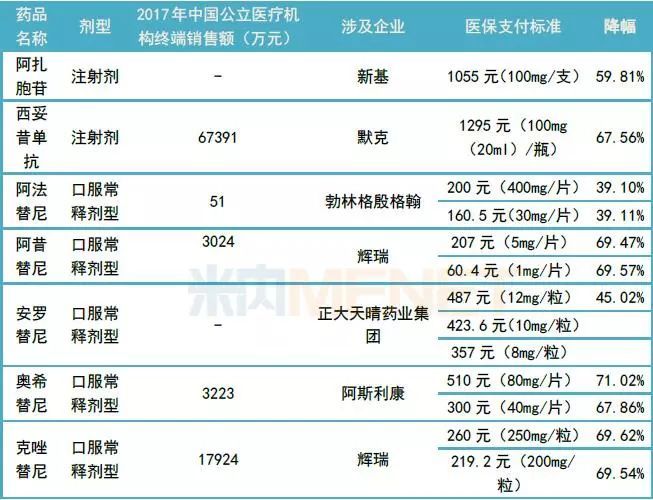 10月10日,中国政府网发布通知,正式将阿扎胞苷等17个抗肿瘤药纳入《国家基本医疗保险、工伤保险和生育保险药品目录(2017年版)》乙类范围,并确定了医保支付标准。据悉,17个谈判药品与平均零售价相比,平均降幅达56.7%,大部分进口药品谈判后的支付标准低于周边国家或地区市场价格,平均低36%。