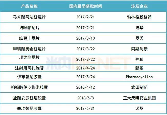 10个2017年后获批上市的产品中,除了正大天晴的盐酸安罗替尼胶囊,其余均为国外进口产品,其中不乏有跨国药企的畅销产品。