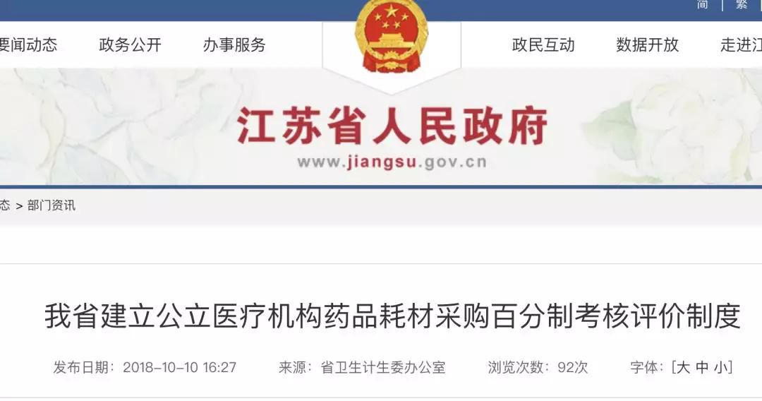 近日,江苏省印发《江苏省公立医疗机构药品耗材采购监督考核办法(试行)》,为加强江苏省公立医疗机构耗材采购监督管理,要建立耗材(药品)采购百分制考核评价制度。对公立医院的考核指标涉及“两票制”、医院回款、配送、使用监控等8项。廉洁购销实行一票否决制,最终的考核结果直接与医院、院长的绩效考评挂钩。