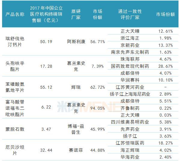近半个月,黑龙江省、湖北省、湖南省先后发文,对通过一致性评价厂家数已达3家的品种,暂停未通过一致性评价厂家品种的采购或挂网交易资格。截至目前,共有6个品种通过一致性评价厂家数已达3家,其中有2个品种在2017年中国公立医疗机构终端销售额超过50亿元。