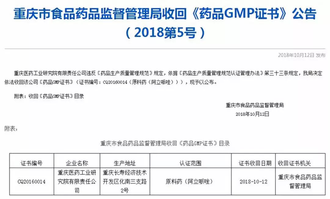 近日,又一原料药“出事”。重庆市食药监局发布《行政处罚决定书》和收回《药品GMP证书》公告,重庆市食药监局给予重庆医药工业研究院有限责任公司警告处罚,并收回其阿立哌唑原料药《药品GMP证书》。据资料显示,重庆医工院的背后由复星医药和重药控股两家A股上市药企持股。