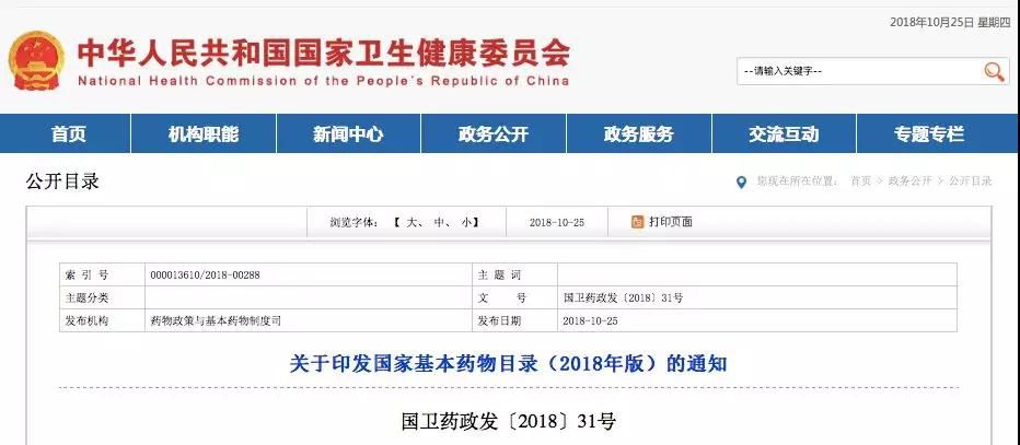 10月25日,国家卫健委正式发布《国家基本药物目录(2018年版)》,目录将于11月1日起在全国正式实施。