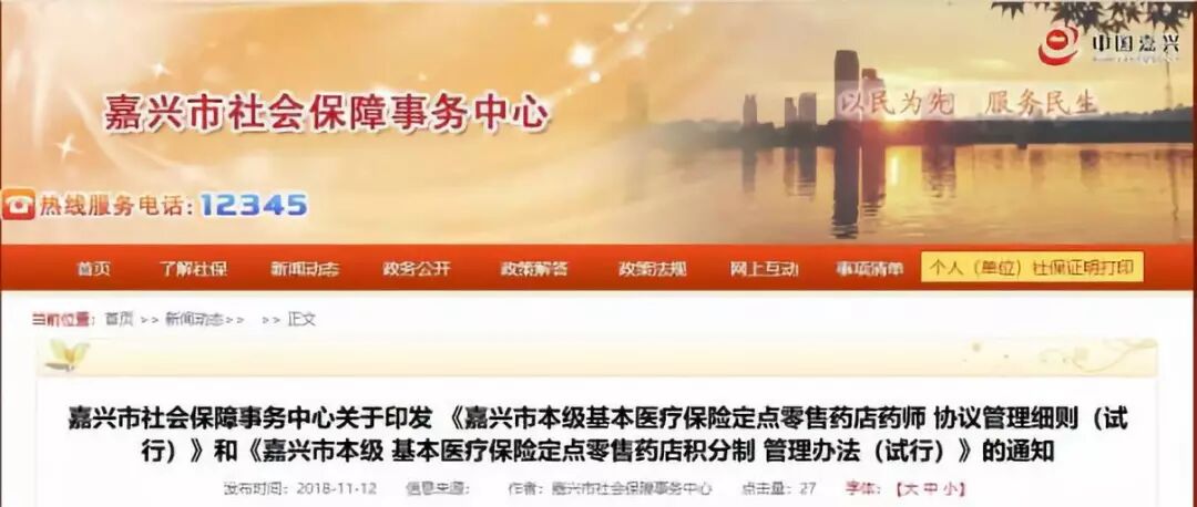 11月12日,嘉兴市社会保障事务中心印发了《嘉兴市本级基本医疗保险定点零售药店药师协议管理细则(试行)》和《嘉兴市本级基本医疗保险定点零售药店积分制管理办法(试行)》的通知,对医保药师、药店进行积分制管理。