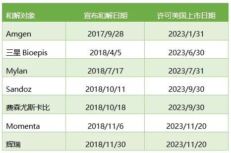 这是目前为止第7家与AbbVie就Humira专利诉讼达成和解的公司。之前6家分别是Amgen、费森尤斯卡比、三星Bioepis、Mylan、Sandoz、Momenta。其中Amgen、Sandoz的阿达木单抗类似物已经先后于2016年和2018年被FDA批准。
