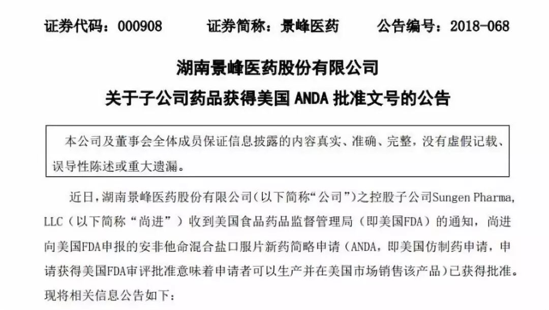 近日,湖南景峰医药股份有限公司(以下简称“公司”)之控股子公司Sungen Pharma,LLC(以下简称“尚进”)收到美国食品药品监督管理局(即美国FDA)的通知,尚进向美国FDA申报的安非他命混合盐口服片新药简略申请(ANDA,即美国仿制药申请,申请获得美国FDA审评批准意味着申请者可以生产并在美国市场销售该产品)已获得批准。