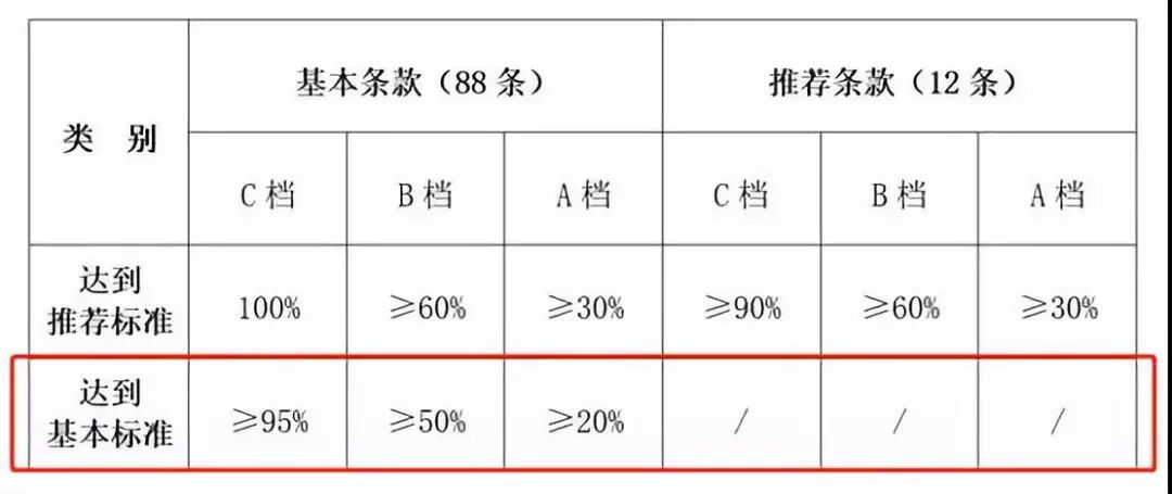 新版标准总共100条,分为88条基本条款和12条推荐条款,采用ABCD四个档次进行记分,A档代表“优秀”,B档代表“良好”,C档代表“合格”,D档代表“不合格”。