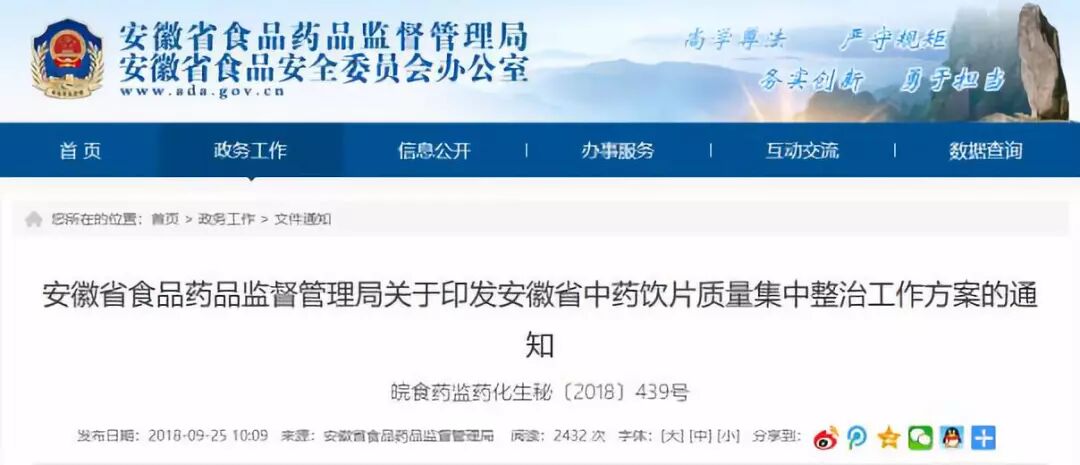 9月25日,安徽省食品药品监督管理局发布了中药饮片质量集中整治工作方案,要针对中药饮片突出问题对全省生产、流通、使用企业进行检查。